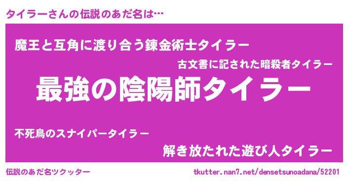 | 意味不明あだ名 | 『住所不定無職タイラー(93歳)』 |