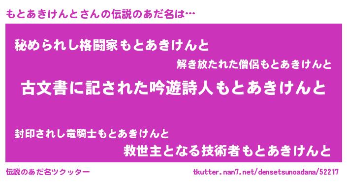 | 男性向けラノベタイトル風あだ名 | 『もとあきけんと~年齢イコール彼女いない歴の魔法使い~』 |