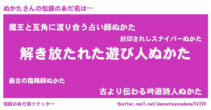 | ヒーロー風カッコイイあだ名 | 『仮面ヌカダー』『銀牙騎士ヌカ』 |