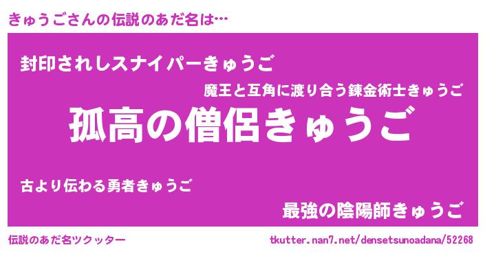| 男性向けラノベタイトル風あだ名 | 『魔弾の王ときゅうご』『きゅうごの憂鬱』 |