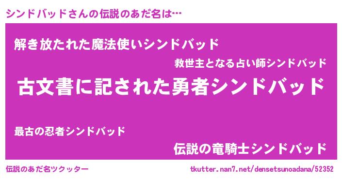 | 男性向けラノベタイトル風あだ名 | 『シンドバッド~年齢イコール彼女いない歴の魔法使い~』 |
