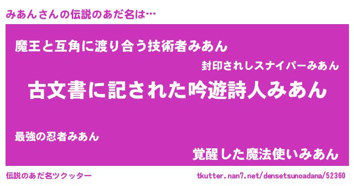 | 男性向けラノベタイトル風あだ名 | 『この素晴らしい世界にみあんを!』 |