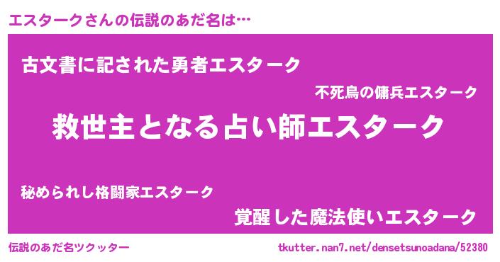 | 男性向けラノベタイトル風あだ名 | 『エスターク~年齢イコール彼女いない歴の魔法使い~』 |