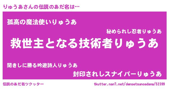 | ヒーロー風カッコイイあだ名 | 『最強戦士リュウア』『天弓騎士リュ』 |