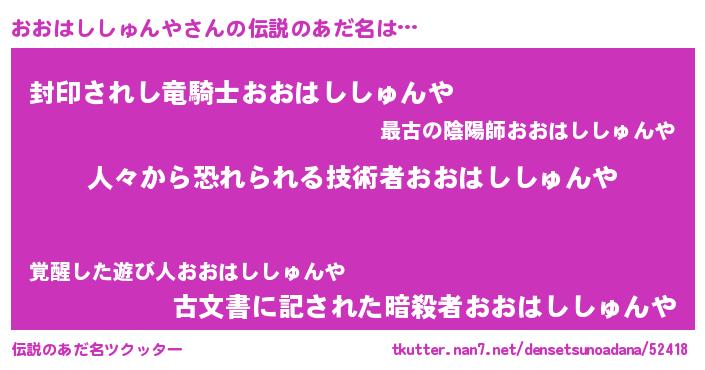 | 男性向けラノベタイトル風あだ名 | 『おまえをオタクにしてやるから、俺をおおはししゅんやにしてくれ! 』 |