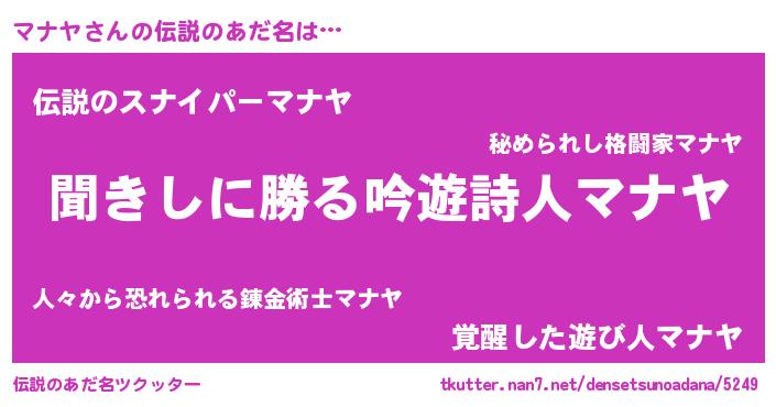 | 意味不明あだ名 | 『自称マナヤ』『永久保存マナヤ』 |