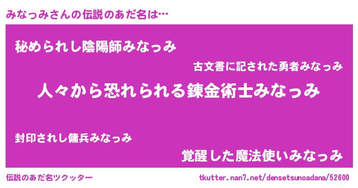 | ヒーロー風カッコイイあだ名 | 『友情の使者みなっみ』『暗黒騎士ミナ』 |