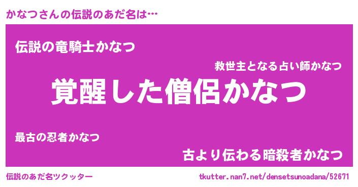| ヒーロー風カッコイイあだ名 | 『幻影騎士カナ』『ウルトラ戦士カナツ』 |