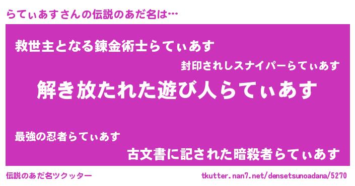 | 男性向けラノベタイトル風あだ名 | 『らてぃあすの嫁は女の子じゃないと思った?』 |