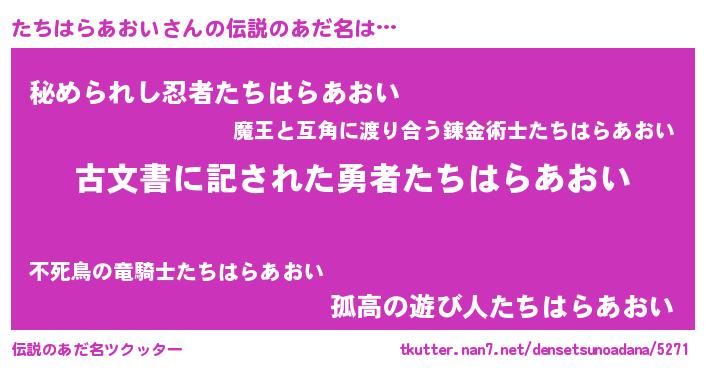 | ヒーロー風カッコイイあだ名 | 『ネオタチハラアオイ』『魔戒騎士タチ』 |