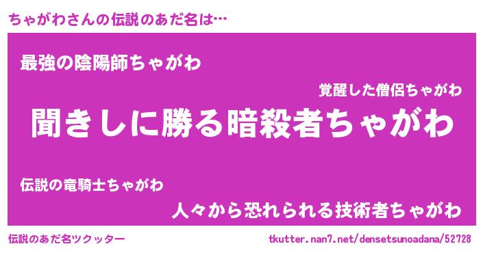 | 男性向けラノベタイトル風あだ名 | 『チャガワスレイヤー』『緋弾のチャガワ』 |