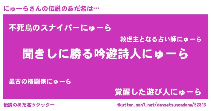 | 男性向けラノベタイトル風あだ名 | 『にゅーらという概念が存在しない退屈な世界 』 |