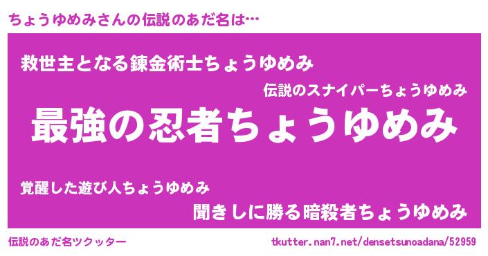 | 男性向けラノベタイトル風あだ名 | 『うちのちょうゆめみが世界を掌握している!』 |