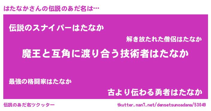| 男性向けラノベタイトル風あだ名 | 『Re:はたなかから始める異世界生活』 |