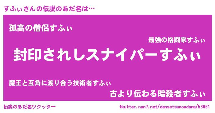 | 男性向けラノベタイトル風あだ名 | 『うちのすふぃが世界を掌握している!』 |