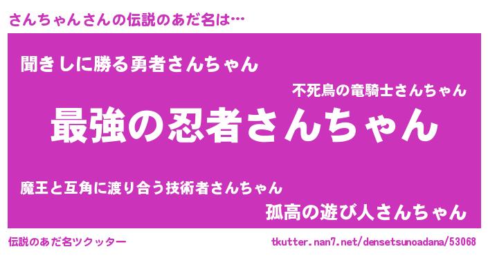 | 男性向けラノベタイトル風あだ名 | 『さんちゃん~年齢イコール彼女いない歴の魔法使い~』 |