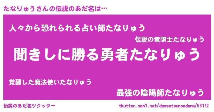 | 胡散臭い通販商品みたいなあだ名 | 『絶対に幸福をもたらす水素水…その名も「たなりゅう」』 |
