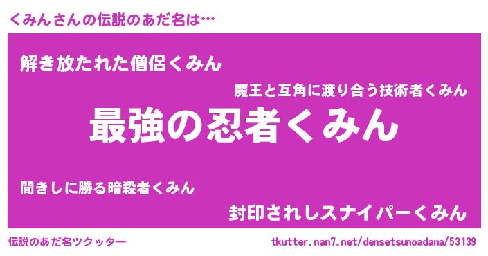 | 男性向けラノベタイトル風あだ名 | 『この素晴らしい世界にくみんを!』 |