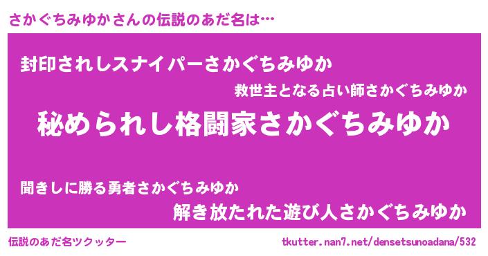 | 男性向けラノベタイトル風あだ名 | 『やはりさかぐちみゆかの青春ラブコメはまちがっている 』 |