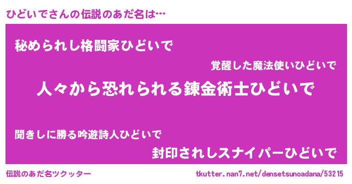 | 意味不明あだ名 | 『自称ひどいで』『ヨモギ科ひどいで属』 |