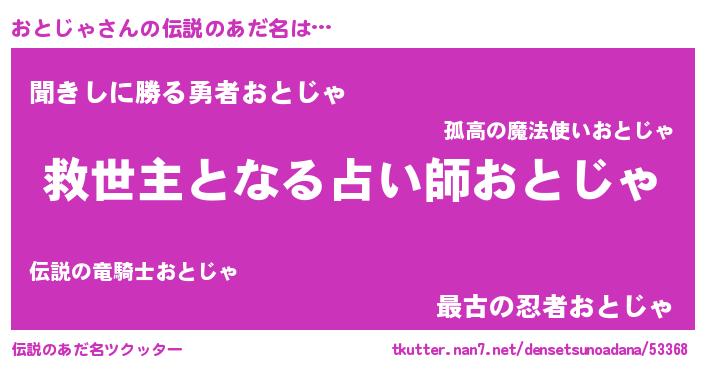 | 胡散臭い通販商品みたいなあだ名 | 『あなたにだけ特別に提供する限定10本のレアな日本酒…その名も「おとじゃ」』 |