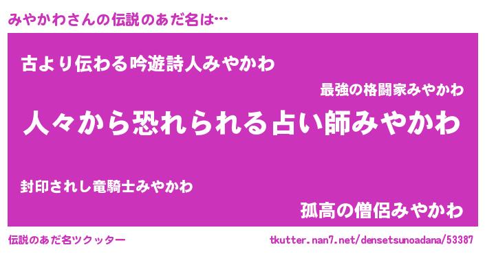 | 男性向けラノベタイトル風あだ名 | 『おまえをオタクにしてやるから、俺をみやかわにしてくれ! 』 |