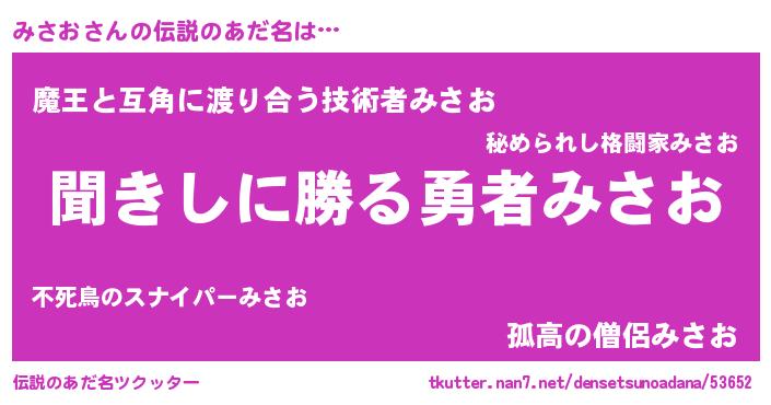 | 男性向けラノベタイトル風あだ名 | 『ミサオスレイヤー』『魔弾の王とみさお』 |