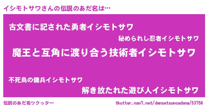 | ヒーロー風カッコイイあだ名 | 『仮面イシダー』『ネオイシモトサワ』 |