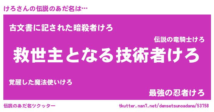 | ヒーロー風カッコイイあだ名 | 『慈愛の使者けろ』『最強戦士ケロ』 |