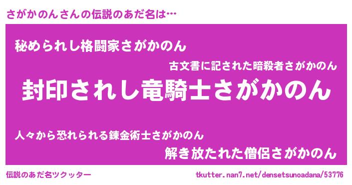 | 男性向けラノベタイトル風あだ名 | 『サガカノンアートオンライン』 |