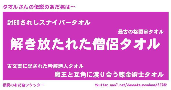 | 女子向けラノベタイトル風あだ名 | 『タオルの卵を拾いまして』 |