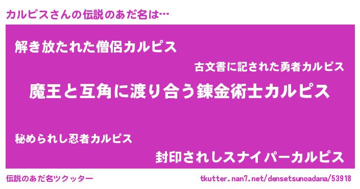 | 女子向けラノベタイトル風あだ名 | 『カルピス恋絵巻』『カルピスの婚約者』 |