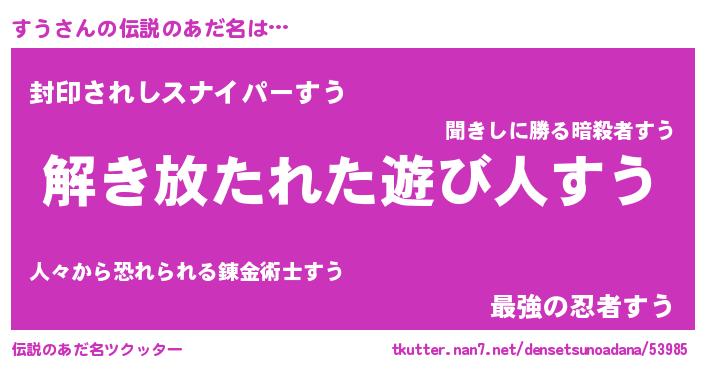 | 男性向けラノベタイトル風あだ名 | 『この素晴らしい世界にすうを!』 |
