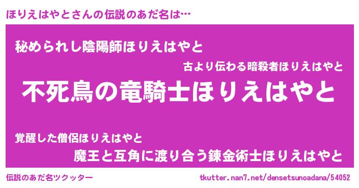 | 女子向けラノベタイトル風あだ名 | 『ほりえはやと姫と円卓の騎士』 |