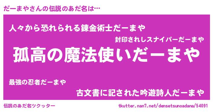 | 男性向けラノベタイトル風あだ名 | 『魔弾の王とだーまや』 |