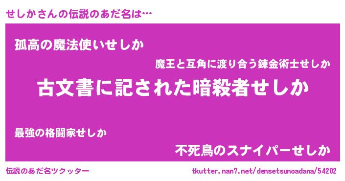 | 男性向けラノベタイトル風あだ名 | 『この素晴らしい世界にせしかを!』 |