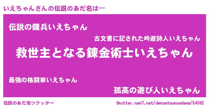 | ヒーロー風カッコイイあだ名 | 『慈愛の使者いえちゃん』『魔戒騎士イエ』 |