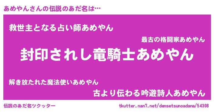 | ヒーロー風カッコイイあだ名 | 『スーパーアメヤン』『愛の使者あめやん』 |