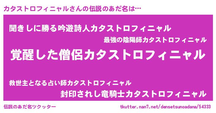 | 男性向けラノベタイトル風あだ名 | 『カタストロフィニャル~年齢イコール彼女いない歴の魔法使い~』 |