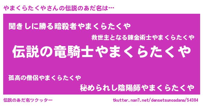 | 女子向けラノベタイトル風あだ名 | 『(仮)やまくらたくやのやんごとなき事情』 |