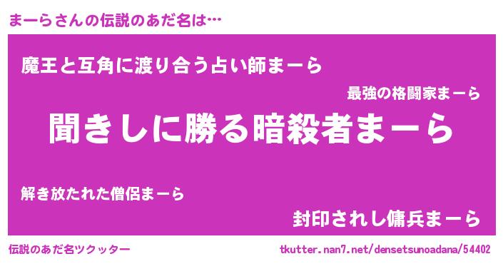 | 男性向けラノベタイトル風あだ名 | 『まーらという概念が存在しない退屈な世界 』 |