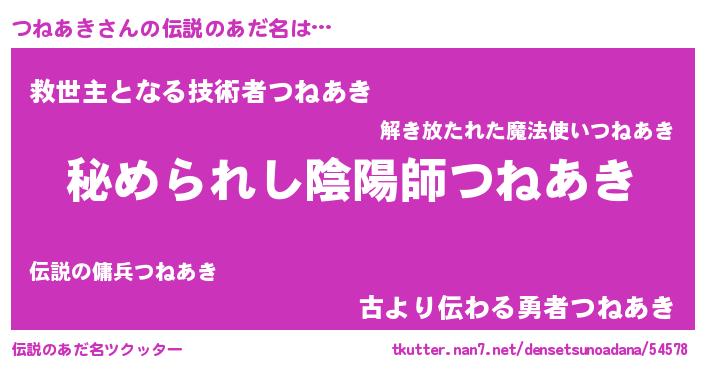 | ファンタジー風あだ名 | 『エターナルツネアキー』『ゼツネトゥ』 |
