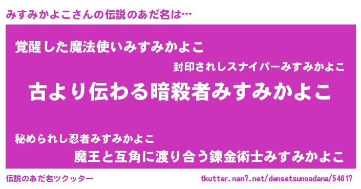 | 女子向けラノベタイトル風あだ名 | 『みすみかよこの契約王妃』 |