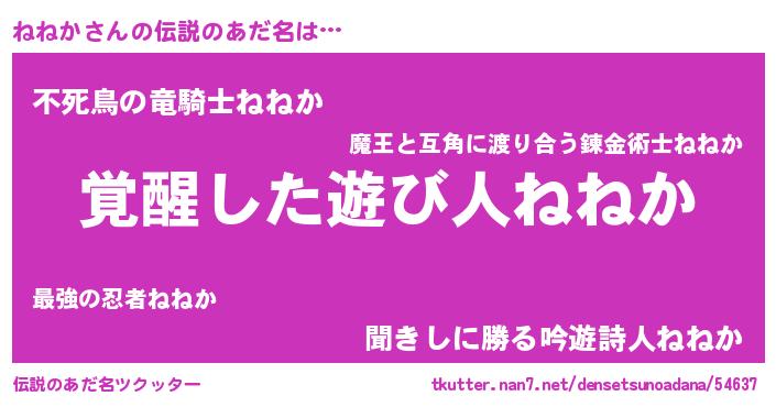 | 男性向けラノベタイトル風あだ名 | 『この素晴らしい世界にねねかを!』 |