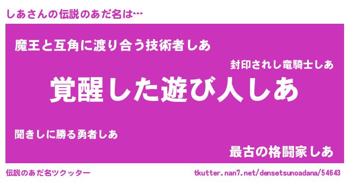 | ヒーロー風カッコイイあだ名 | 『天弓騎士シア』『慈愛の使者しあ』 |