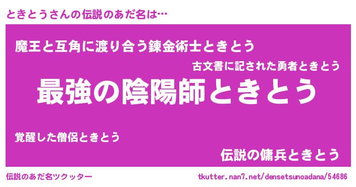 | 男性向けラノベタイトル風あだ名 | 『ときとう~年齢イコール彼女いない歴の魔法使い~』 |