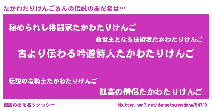 | ヒーロー風カッコイイあだ名 | 『ネオタカワタリケンゴ』『黄金騎士タカ』 |