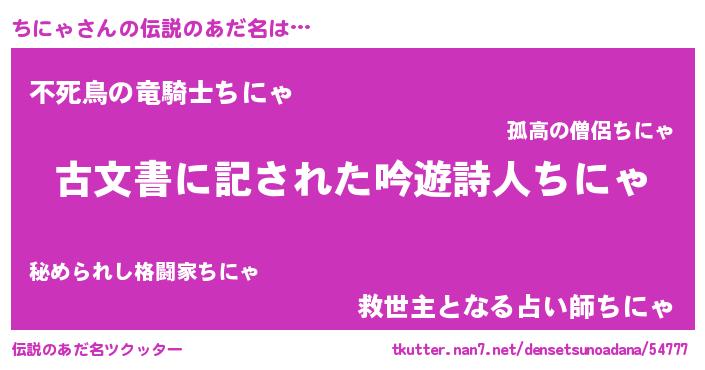 | 男性向けラノベタイトル風あだ名 | 『この素晴らしい世界にちにゃを!』 |