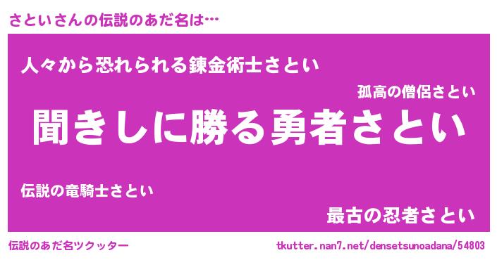| 男性向けラノベタイトル風あだ名 | 『さといという概念が存在しない退屈な世界 』 |