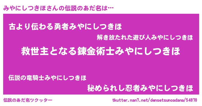 | ヒーロー風カッコイイあだ名 | 『慈愛の使者みやにしつきほ』 |